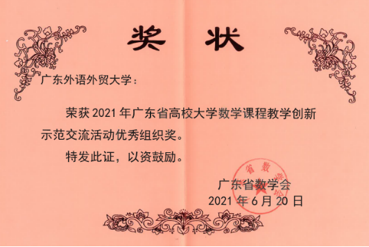 近日,首届(2021)全国高校大学数学课程教学创新示范交流活动(广东赛区)获奖名单公布,我院推荐的五位参赛教师全部获奖,其中一等奖1项,二等奖2项,三等奖1项,优秀奖1项。我校获奖数量和获奖比例均在全省高校中名列前茅,获评优秀组织奖。