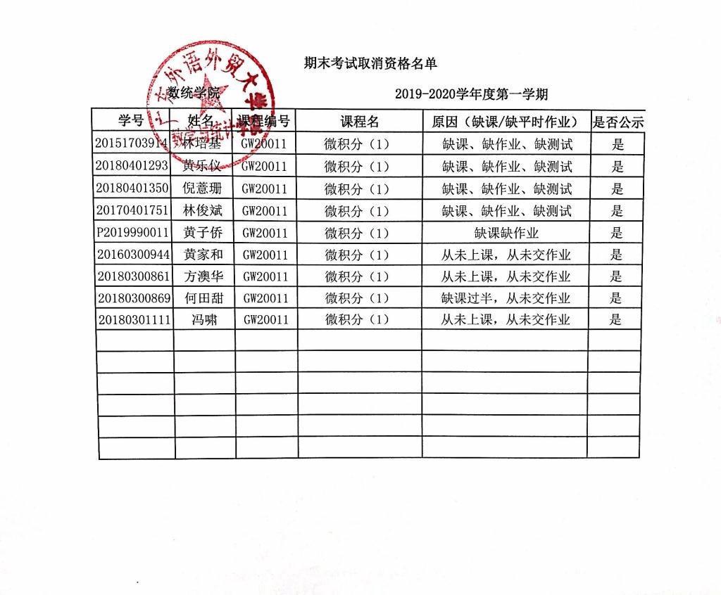 根据《广东外语外贸大学本科生考核管理规定》(广外校[2019]22号)第十三条“学生在一学期内累计缺课超过某门课程教学时数三分之一或缺交作业超过作业总次数三分之一者,取消学生该门课程的考试资格”的规定,现将2019-2020学年第一学期期末考试取消考试资格学生名单公示,公示时间为2019年12月13日至2019年12月16日,具体名单见附件。如对公示内容有异议,请在12月16日以书面并署真实姓名反映到新葡萄8883官网AMG教务办。地址:南校区院系楼154,联系电话:39326982,仇老师。