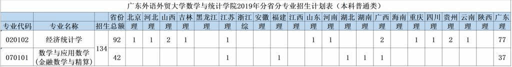 2019年我院计划招收经济统计学专业本科生92名,数学与应用数学(金融数学与精算)专业本科生42名,详细分省份招生计划见下表: